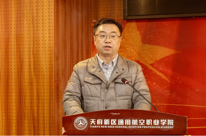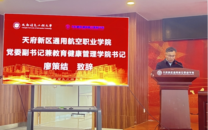 廖策结在致辞中鼓励学生将天府新区通用航空职业学院“尚德、尚技、尚善、尚新”的校训精神与我校的育人理念相结合,明确自考学习路径与目标,努力成为“技能+学历”双优的复合型人才。