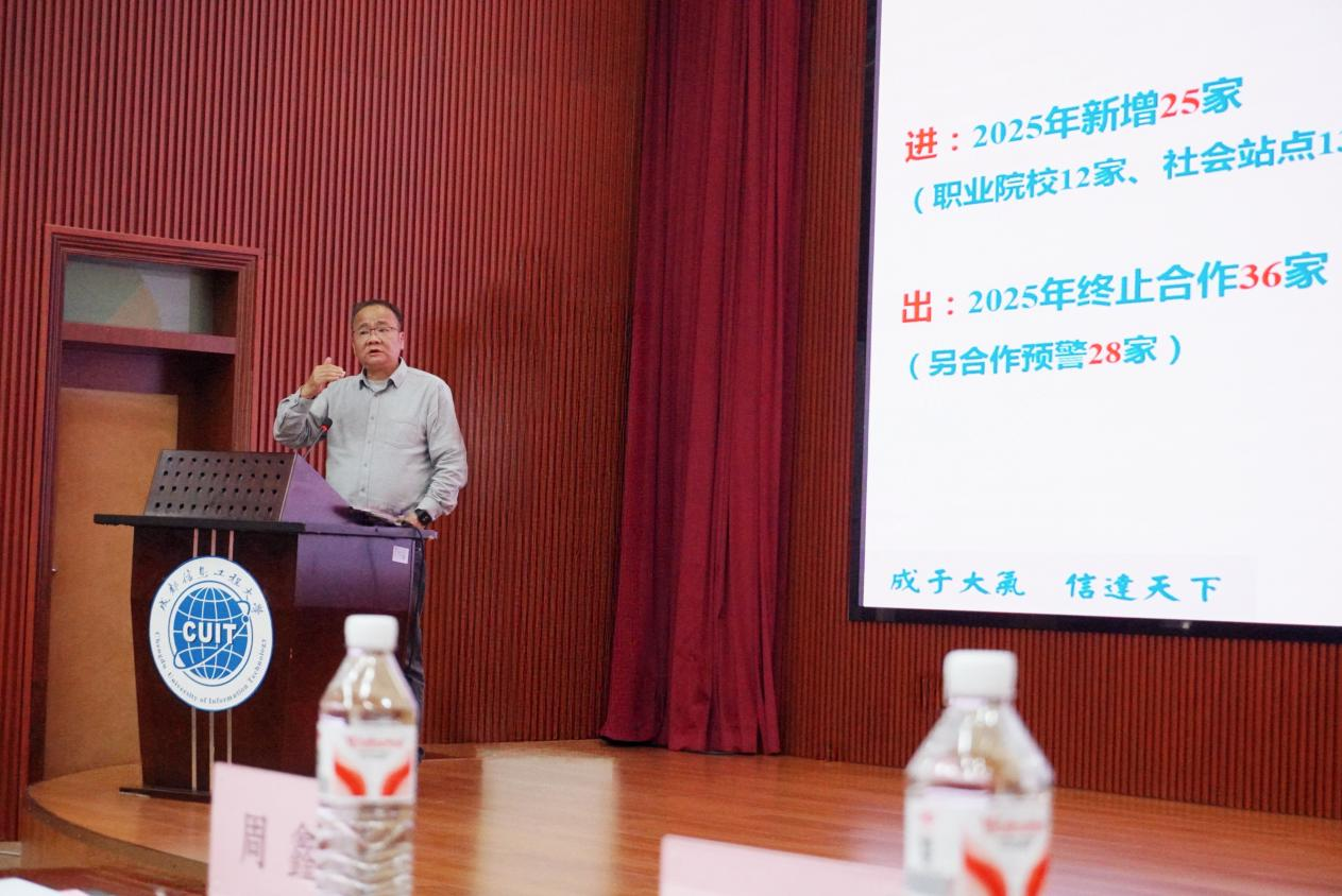 3月11日,我校召开“成都信息工程大学高等教育自学考试2025年度总结表彰暨2026年度发展大会”。学校国内合作处副处长徐俊、继续教育管理负责人李芳,继续教育学院党委书记易平、院长周鑫、副院长狄堃、自考科科长梁波,相关工作人员与校外教学点代表出席会议。会议由继续教育学院副院长邹靳主持。